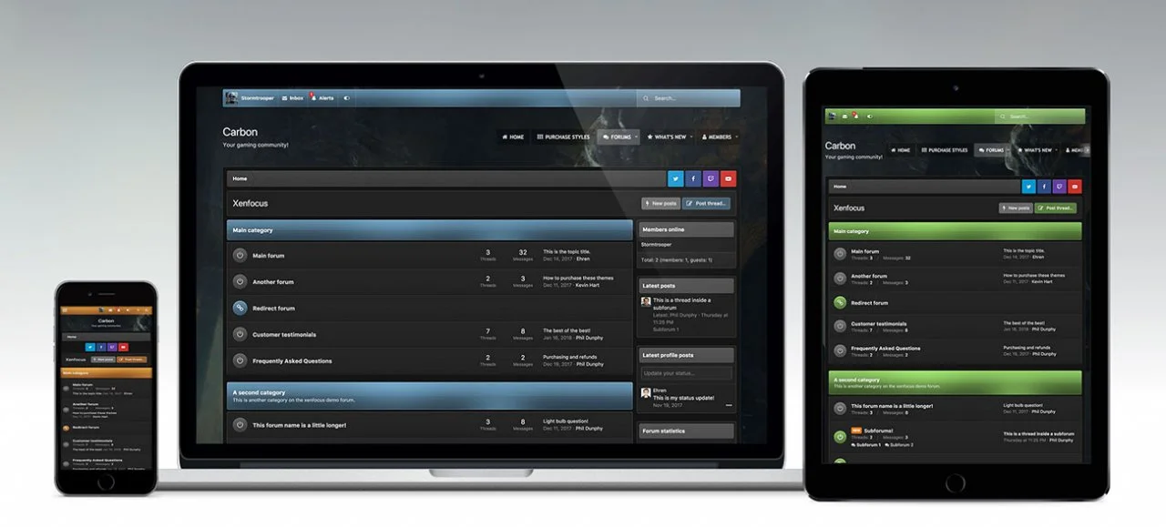 Carbon, named after the carbon texture which is used throughout the design, is a dark theme for xenforo and is especially perfect for gaming sites. Your members can customize the theme themselves by choosing their own color scheme and background image from a preset array!
